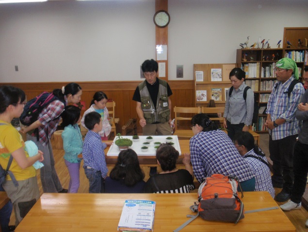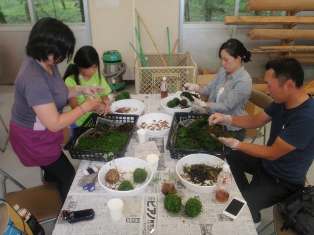 | 日程 | 午前 9時00分 受付 森林展示館 午前 9時15分 オリエンテーション 森林展示館 午前 9時30分 自然観察と苔玉づくり 宮川渓谷外、木工体験館 午前12時00分 閉会・アンケート 木工体験館 |