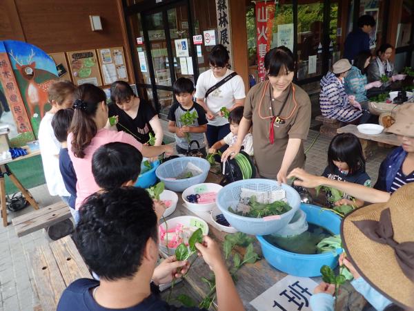 | 日程 | 午前09時30分 受付(森林展示館) 午前09時45分 オリエンテーション(森林展示館) 午前10時00分 自然観察・生葉染め体験(木工体験館及び周辺) 午前12時30分 閉会・アンケート(木工体験館) |