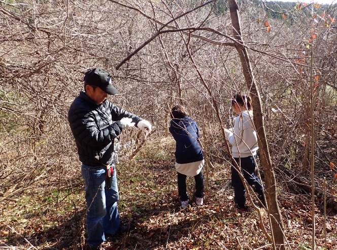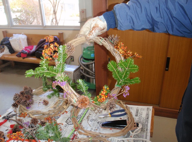 | 内容 | フジなどのつるを切って森林整備を行います。 そのつるを利用してクリスマスリースを作り ます。 |