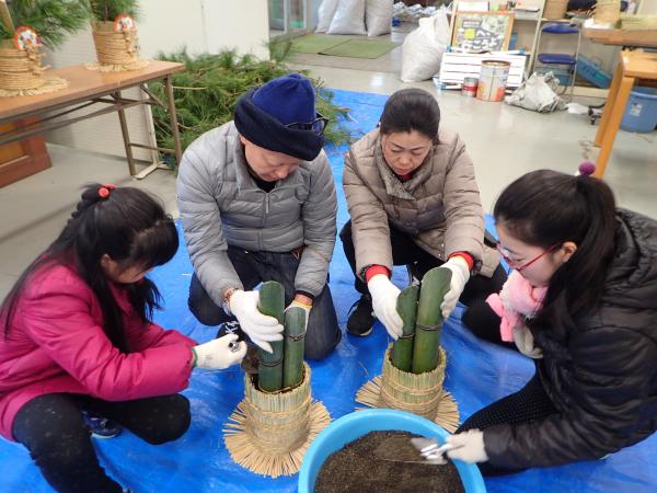 | 内容 | 竹、松の葉、梅の枝を使い、ミニサイズ(巾40Cm×高さ80Cm程度) の門松を作ります。 |