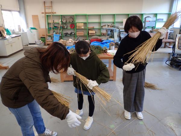 門松の土台作り。ワラが均等な厚さになるよう缶に差していきます。