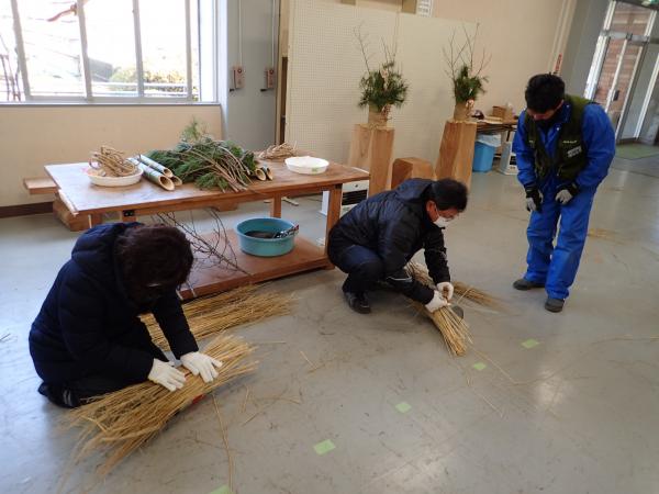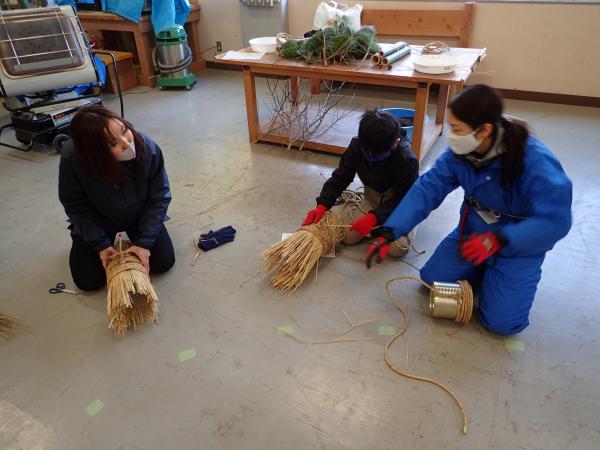 内容 松の葉、竹、梅の枝、わらを組み合わせて、ミニサイズの門松を作ります。