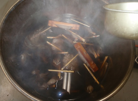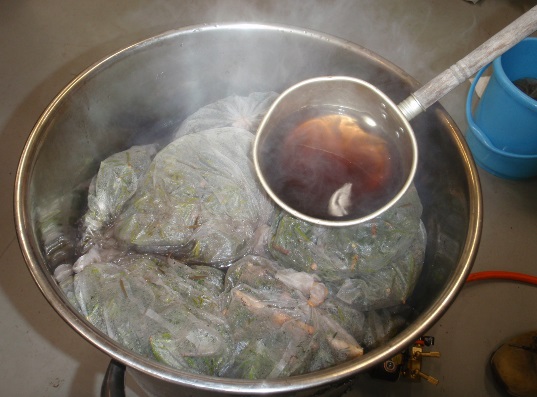 野外で身近な染色に利用できる草木を観察したあと、実際にモミの木の葉で草木染めを体験します。(実際には写真よりもう少し大きめの布で、渋めの色合いになります) 500円 |
