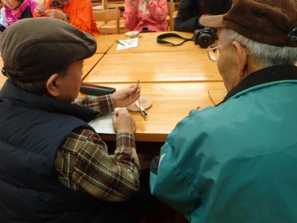 各種の樹木に特有な冬芽を、ルーペを使って観察していただき、野外に出て周辺を散策しました。