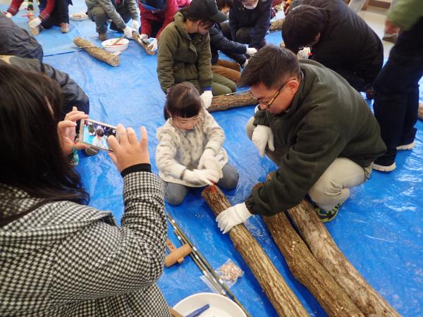 | 趣旨 | 原木にシイタケの植菌を行い、自宅でシイタケの栽培をします。シイタケのおすすめレシピと試食も行い、自然の素晴しさや大切さを実感していただくと共に、自然環境や森林・林業を守り育てる事の大切さへの理解を深めていただきます。 |