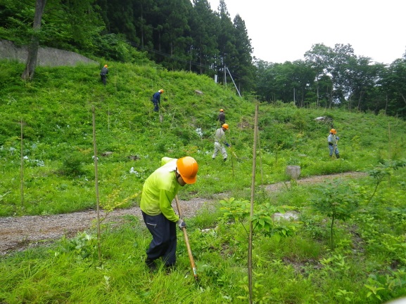 植えた小さな樹木を雑草から守り日の光を十分与え大きく成長させるための草刈り作業を体験します。 |
