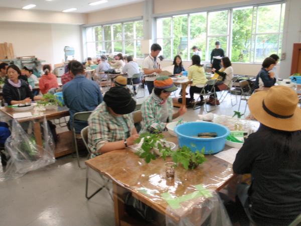 野外で生育する苔などの観察を行った後、身近な植物で苔玉作りを体験していただきました。