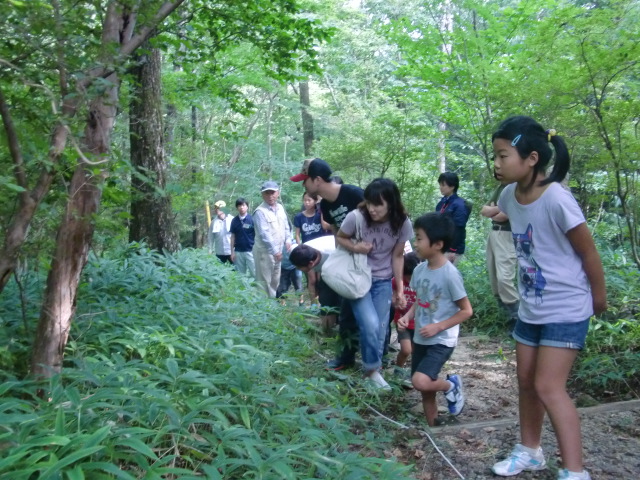翌朝はすがすがしい空気のなか、自然観察を含めたハイキングを行いました。1時間ほどキャンプ事務所をゆっくり歩いて頂き、県民の森の夏の自然を満喫して頂きました。
