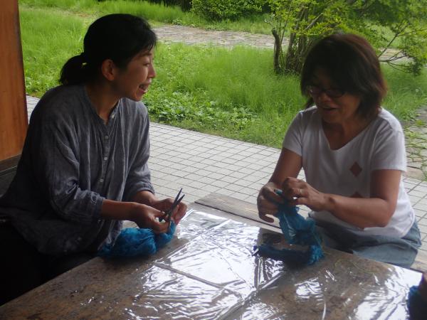 絞り染めの技法を中心とした講座とタデアイを使った生葉染めを体験していただきました。