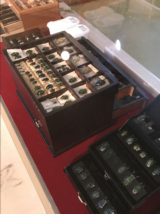 宝石のような甲虫類を、ジュエリーボックスに飾りました。こんな展示品がたくさんあります。プラチナ色の黄金虫(コガネムシ)や彫金細工のようなノコギリカミキリも収まっています。