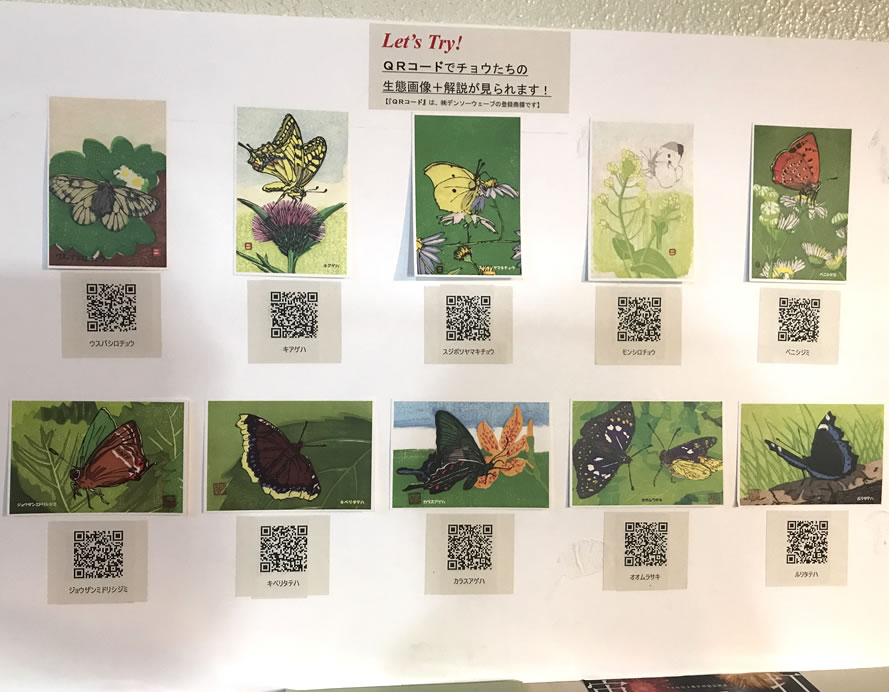 多色摺り版画の下に掲示してある二次元バーコード(QRコード)読み取りアプリで、 「県民の森のチョウ」の生態写真と簡単な解説が見られます。右のコードで試してみてください。