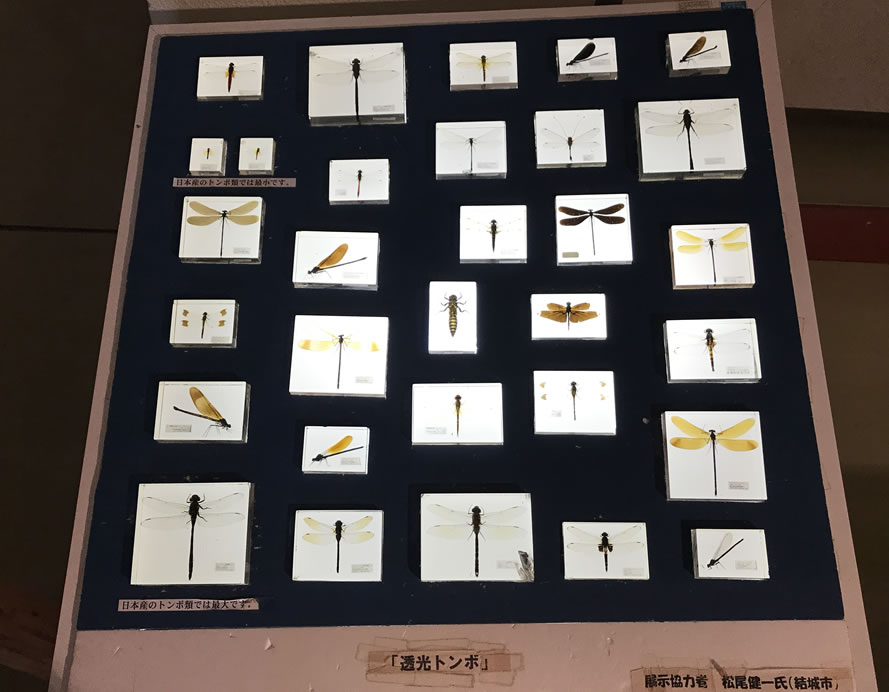 トンボの標本をアクリル樹脂で封じ込め、どの方向からも見られるよう工夫しました。トンボとにらめっこできます。