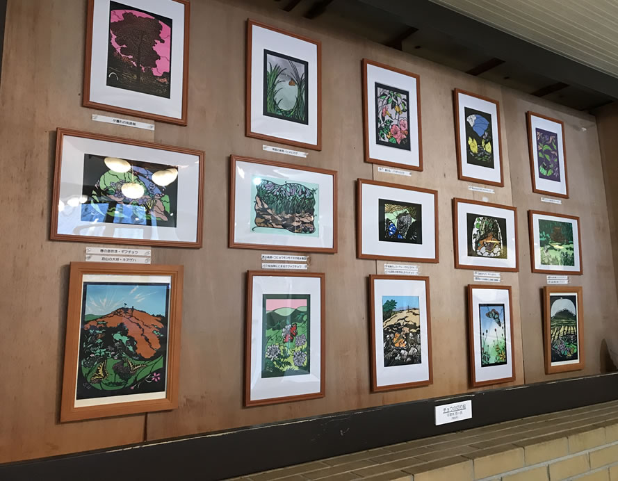 机上の額装は70代シニアの蝶愛好家が制作した『多色摺り版画』です。この机の上で思い思いに「ぬり絵」や「折り紙」など、簡単なワークショップを楽しめます。