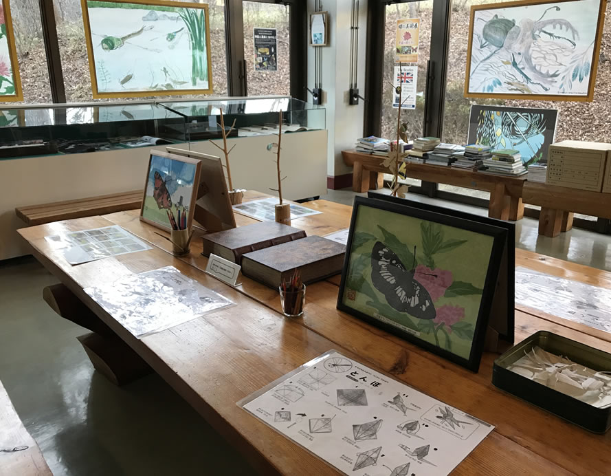 まるで絵画展のような展示物の数々。自然系博物館というよりまるで『昆虫美術館』のようです。名前が表示されていない美しい外国の標本もたくさん!世界の昆虫図鑑や本も自由に見られるので、自分で「絵合わせ」してみるのも楽しいですよ。